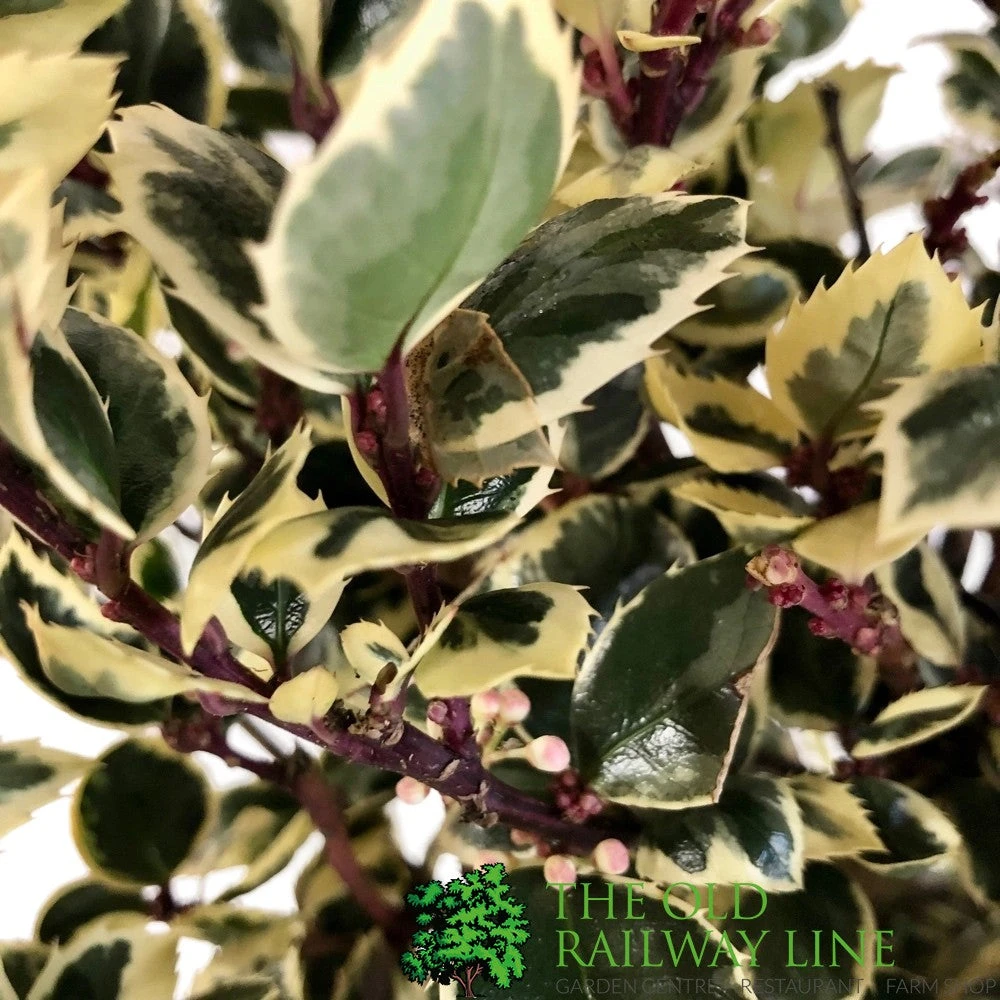 A vigorous, glossy-leaved evergreen holly with cream edging and pink winter hues. Red buds blossom into white flowers in early summer.